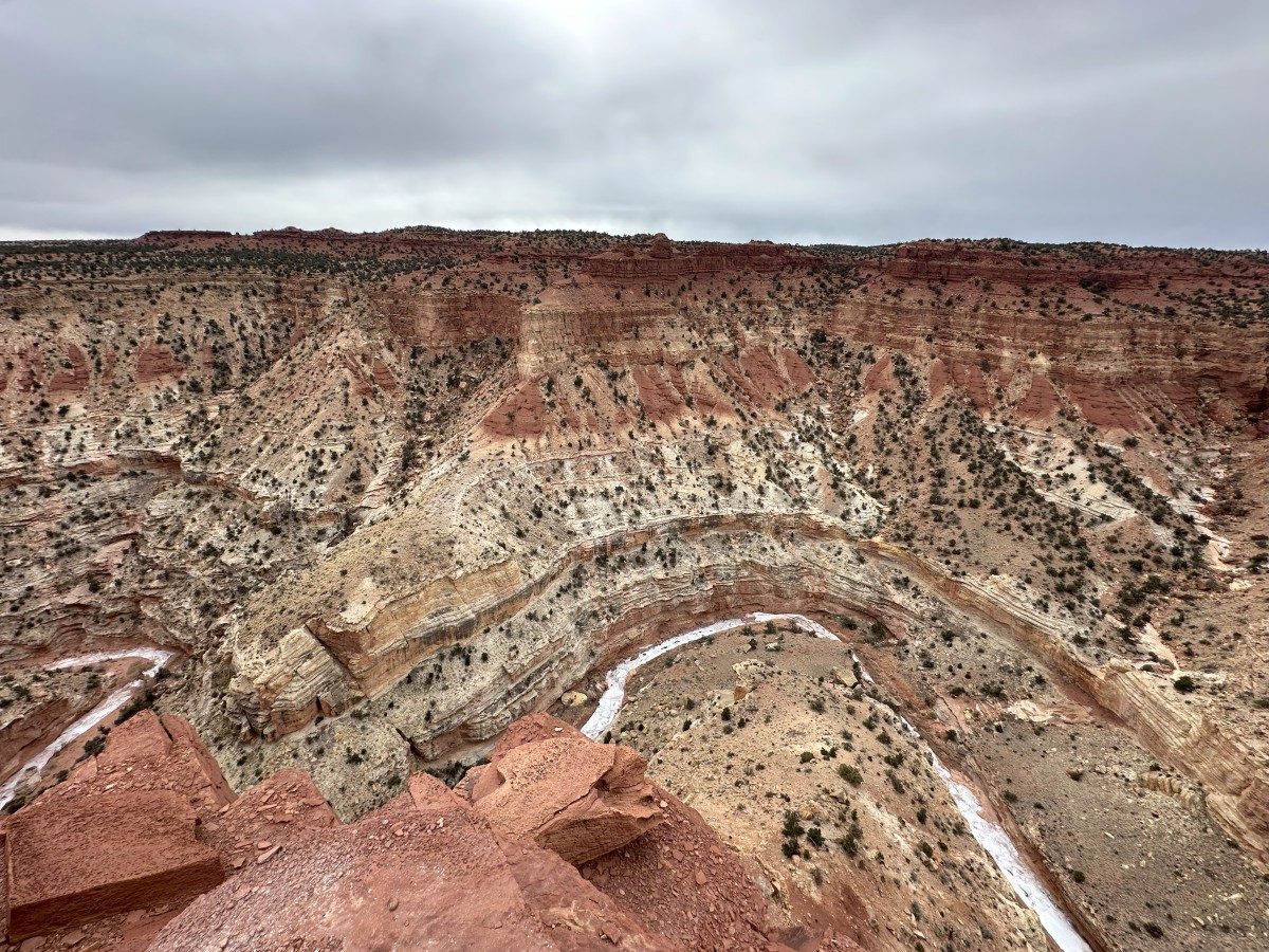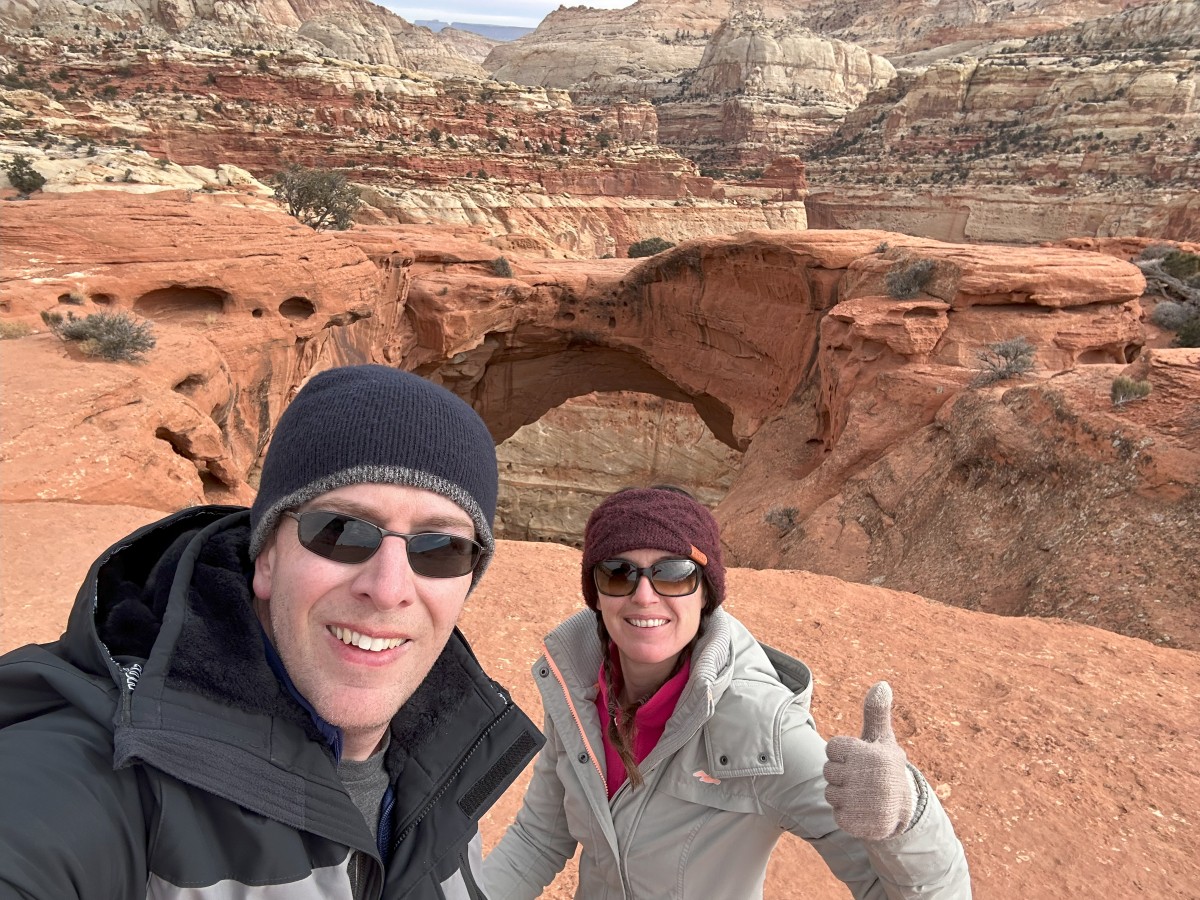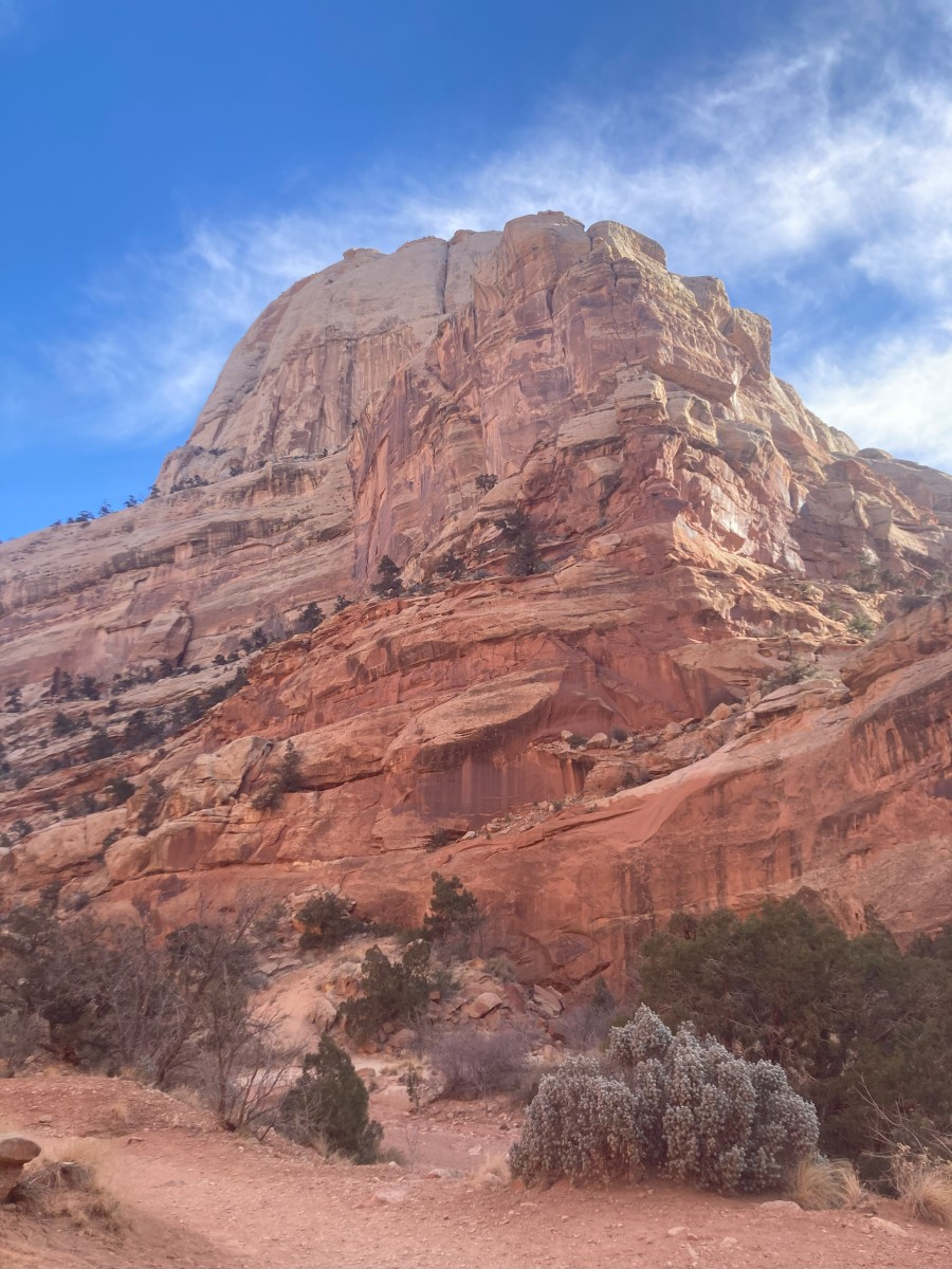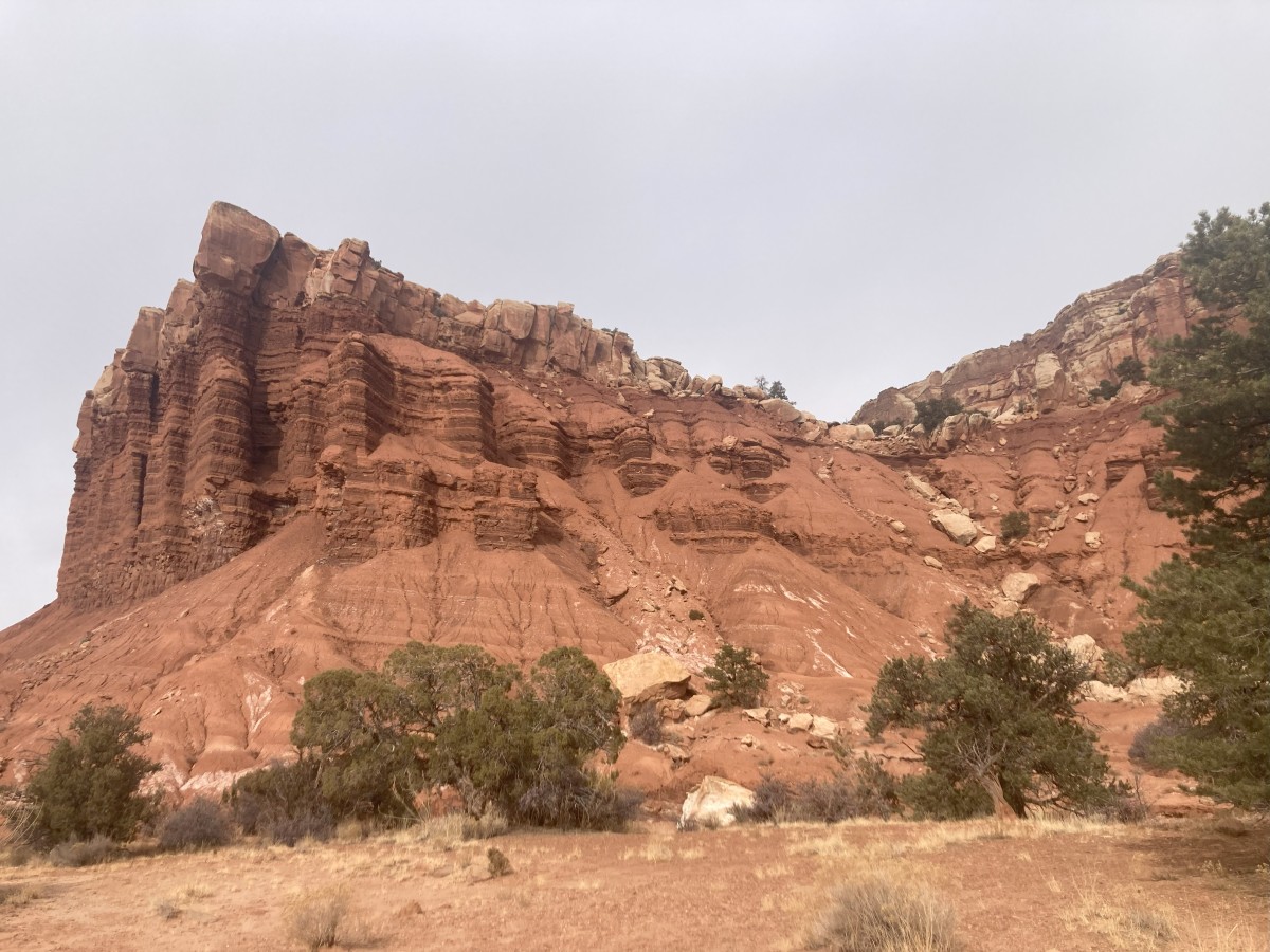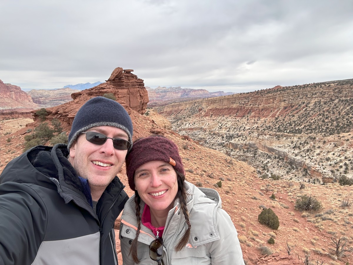 It’s definitely a lot colder here in Capitol Reef, and today was the first day of our whole trip I think where it wasn’t a clear blue sky and sun all day, so we felt the cold when we were out hiking. Cloudy and a bit windy still, but not too bad once you get climbing up steep trails!