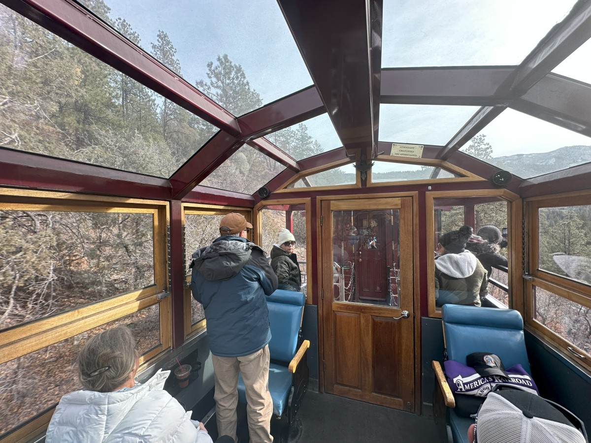 We are only staying in Durango, Colorado for one day and we had booked to go on a scenic train ride up in to the Rockies to a place called Cascade Canyon. This is an old narrow gauge steam train which has a variety of different carriages – we opted for the first class carriage (I think I can charge this to work expenses right, Gav?) with a glass panorama roof for the best views. Including unlimited coffee and soft drinks and various souvenirs