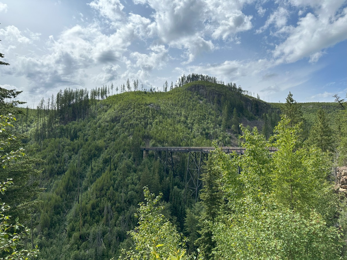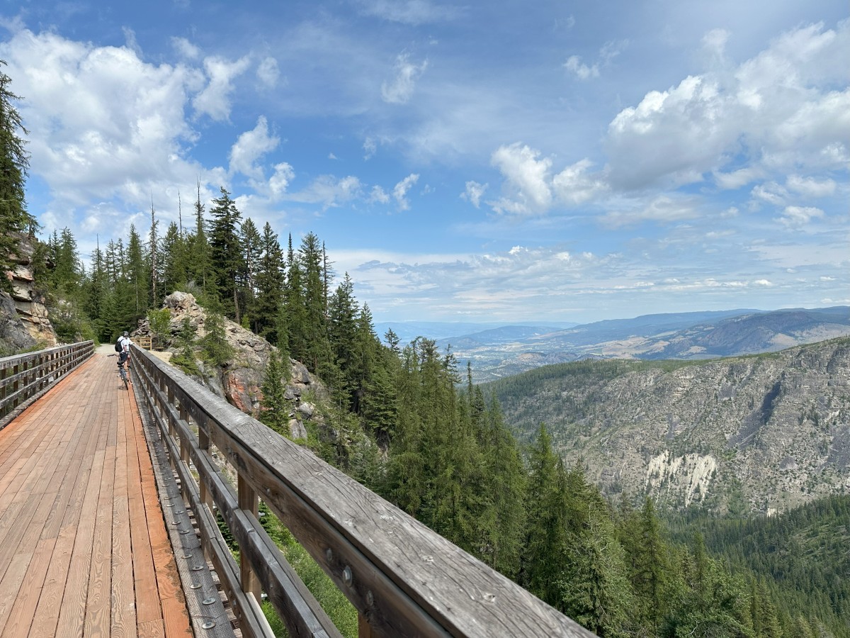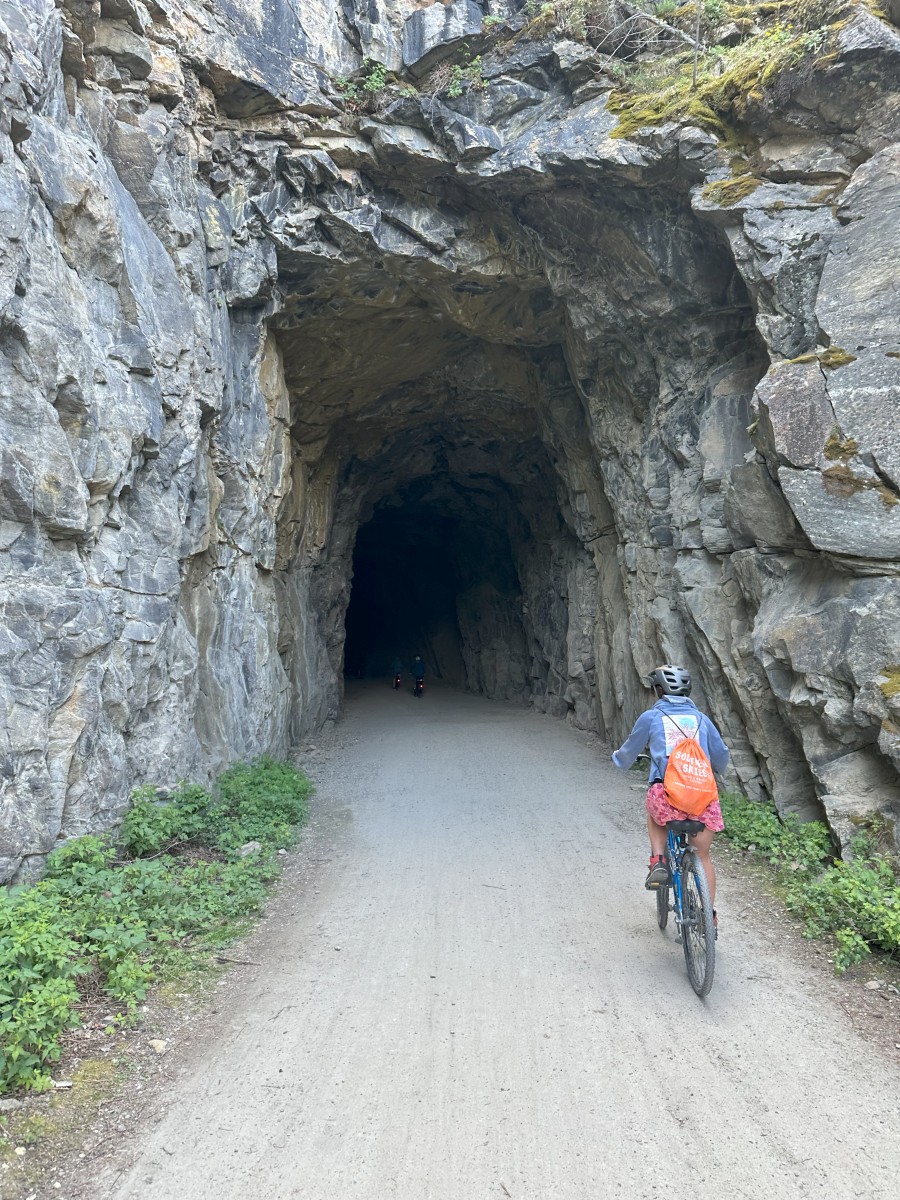The trail takes you along part of the Kettle Valley Railway (KVR) and there are 18x wooden trestle bridges, 2x steel bridges and and 2x tunnels that you need to navigate your way through. As you are high up in the mountains the views of the canyon and valleys below are absolutely glorious, but you did have to be somewhat careful whilst you were cycling i.e. you didn’t want to get too near the edge where there was a sheer drop in places! You can actually hike the trail instead but at 24km, we wanted to do it all so biking seemed more sensible.
