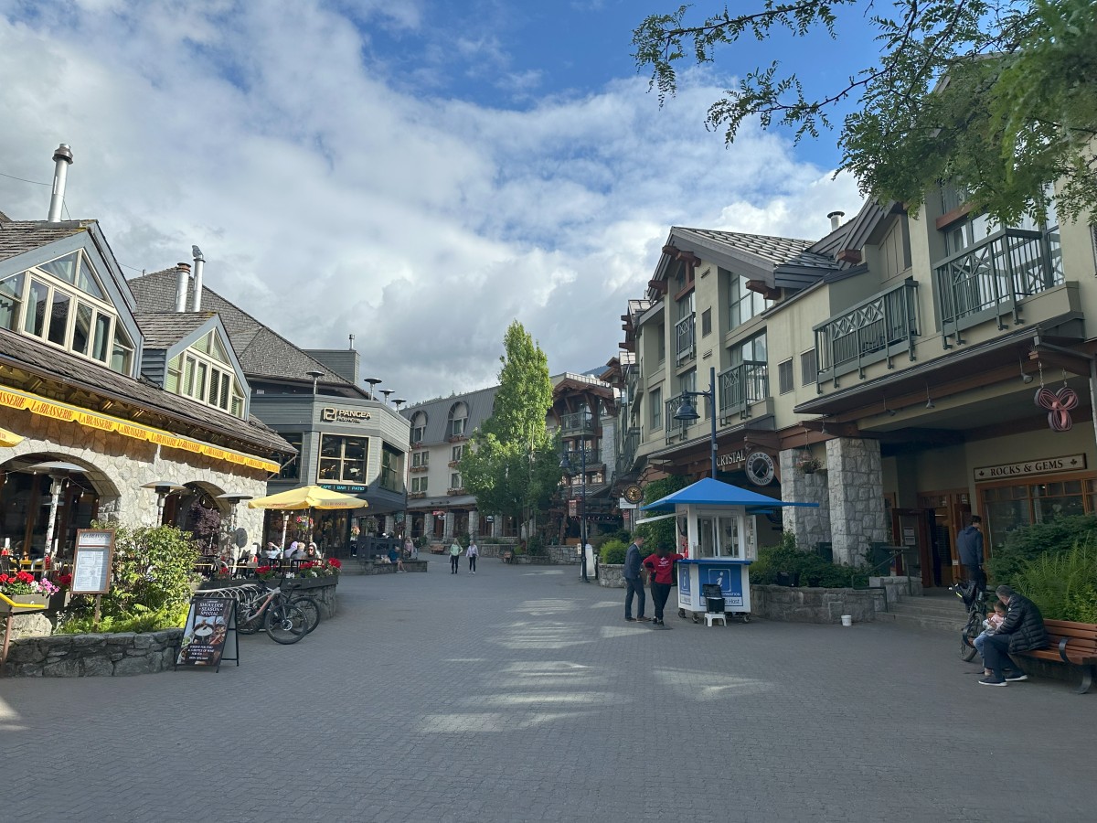 We eventually arrived in Whistler at around 2.30pm. It’s a really nice small village, normally used as a ski destination with loads of lodges and hotels but at this time of year there’s no snow at all, so all the slopes are clear and ski lifts not operating. There’s lots going on though with loads of bars, shops, restaurants and outdoor activities to do around the area. Definitely has the feel of a mountain resort area.